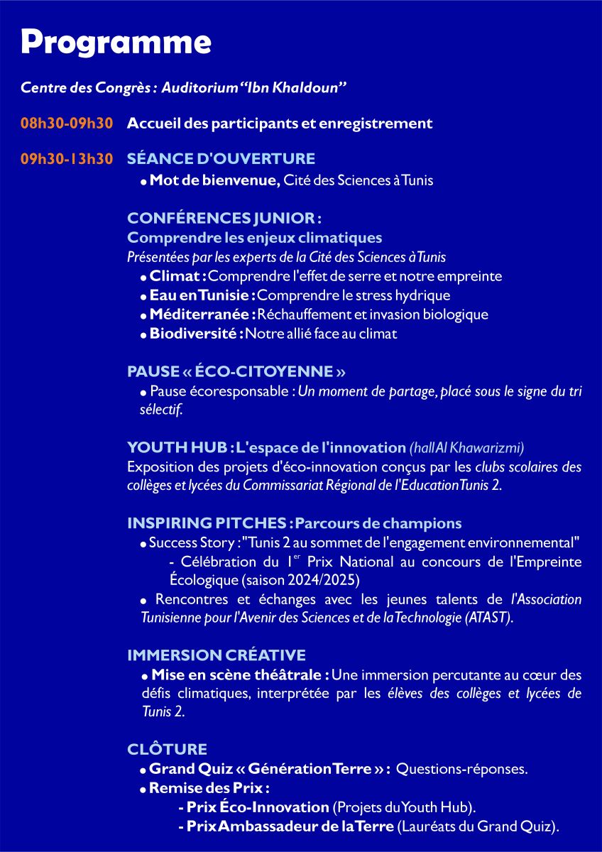 La Cité des Sciences à Tunis donne la parole à la jeunesse ! Le samedi 25 avril 2026, à l'occasion de la Journée Mondiale de la Terre, nous lançons un rendez-vous inédit: